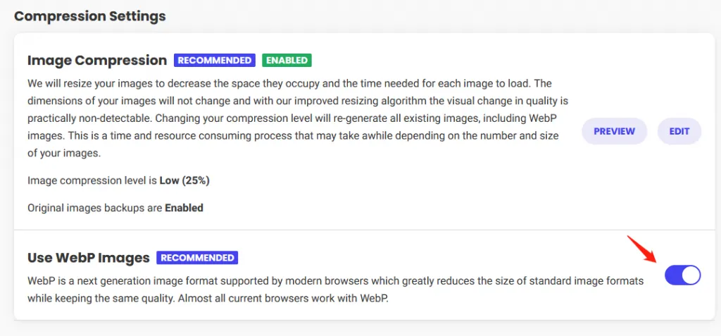 这个开关在建站之初就好设置好,以后不能再改,否则会删掉手动上传的webp格式图片